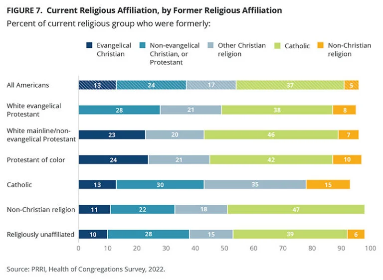 Among Americans who left their religious tradition, 37% say they were formerly Catholic, more than any other group. The survey also found that among mainline Protestants, 46% were previously Catholic, and among Black Hispanic and Asian Protestants, 42% are formerly Catholic.
