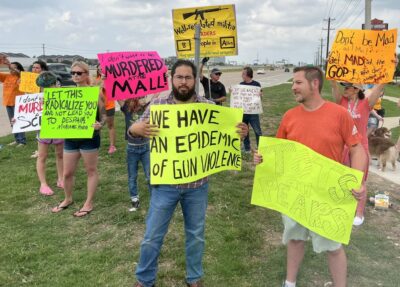 At a street corner by a main church entrance, a few dozen protesters waved signs such as “Thoughts and prayers are useless” and “We have an epidemic of gun violence.”