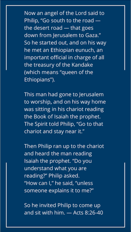 I believe that Scripture tells us that a racially and ethnically diverse, socially progressive future is possible. In Acts 8, Phillip is mystically whisked away to encounter a stranger on a desolate road. The man, an important and perhaps wealthy figure in his own country, is pondering a text from Isaiah as he rides home in his chariot, and Phillip, prompted by the Holy Spirit, approaches this man with his own interpretation of the text — and tells him the good news about Jesus.