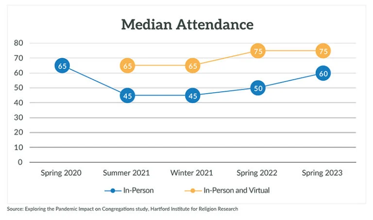 Researchers also found that 16% of worship attendees were new people in 2023, up from 5% in 2020. A number of people also continue to attend services online — an average of about 25 people, according to the congregations that track their online attendance. About half of congregations do so, with a median attendance of 75 overall, including online and in-person.