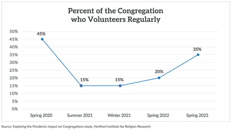 In other findings, volunteerism is bouncing back, with congregations reporting that a third (35%) of their members volunteer regularly, up from 15% in 2021 and 20% in 2022. That number, however, does not match the 45% who volunteered in 2020.