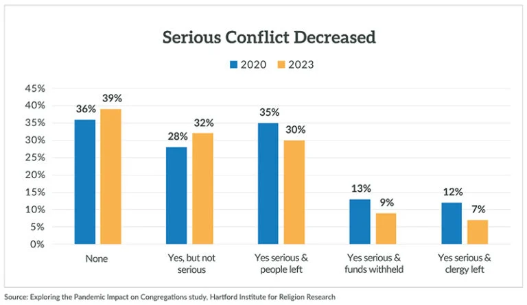 Conflict at congregations has also declined, with 7% reporting that conflict was so serious that clergy left, 9% saying people withheld funds due to conflict and 30% saying people left due to serious conflict. In 2020, 12% of congregations reported that clergy left due to conflict, 13% said people withheld funds due to conflict, and 35% said people left.