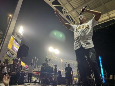 Three minutes later, an electric guitarist and keyboardist from The Rock Church — an evangelical megachurch in San Diego — stirred on the Gallagher Square stage behind center field.