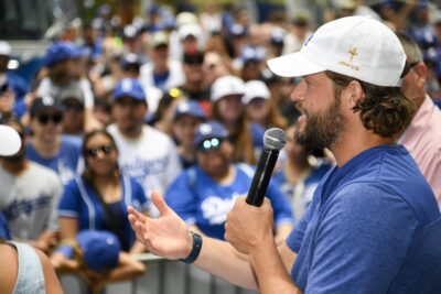 “We’re not great at talking about Jesus in a public way,” Kershaw told the fans, each of whom received a custom white hat with the Dodgers logo, a gold cross and “John 3:16” inscribed on the side. “But what we do want to mention is that we are baseball players that love Jesus, and we wanted to share a little bit about …”