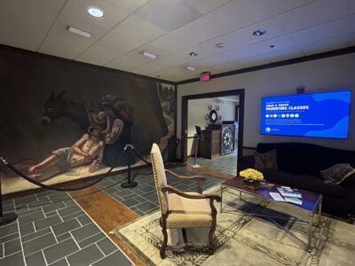 The new counseling center at First Presbyterian Church is in the shadow of “The Good Samaritan.” A fresco depicting the familiar story – impossible to ignore at eight feet tall and 28 feet long – was commissioned by the church and unveiled in 2001 in the then-new fellowship hall. Jesus shares the parable in Luke — how a man beaten and left for dead by robbers is rescued by a Samaritan after a priest and Levite pass him by. Jesus’ command? “Go and do likewise.”