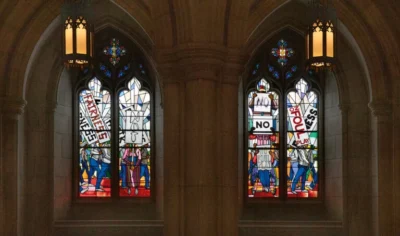 In September, the Washington National Cathedral unveiled its new stained-glass windows that replaced earlier panes honoring Lee and Confederate Gen. Stonewall Jackson. The new additions, titled “Now and Forever” and designed by artist Kerry James Marshall, depict Black protesters carrying signs that say “No Foul Play” and Fairness.”