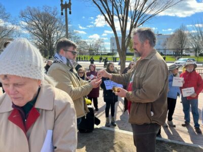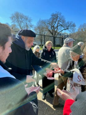 The Rev. Joe Nangle, the 2023 winner of Pax Christi USA’s teacher of peace award, celebrated the Catholic Mass on a folding table in Lafayette Park, instructing protesters in how to distribute ashes to each other. Catholics among the group also received Communion from Eucharistic ministers.