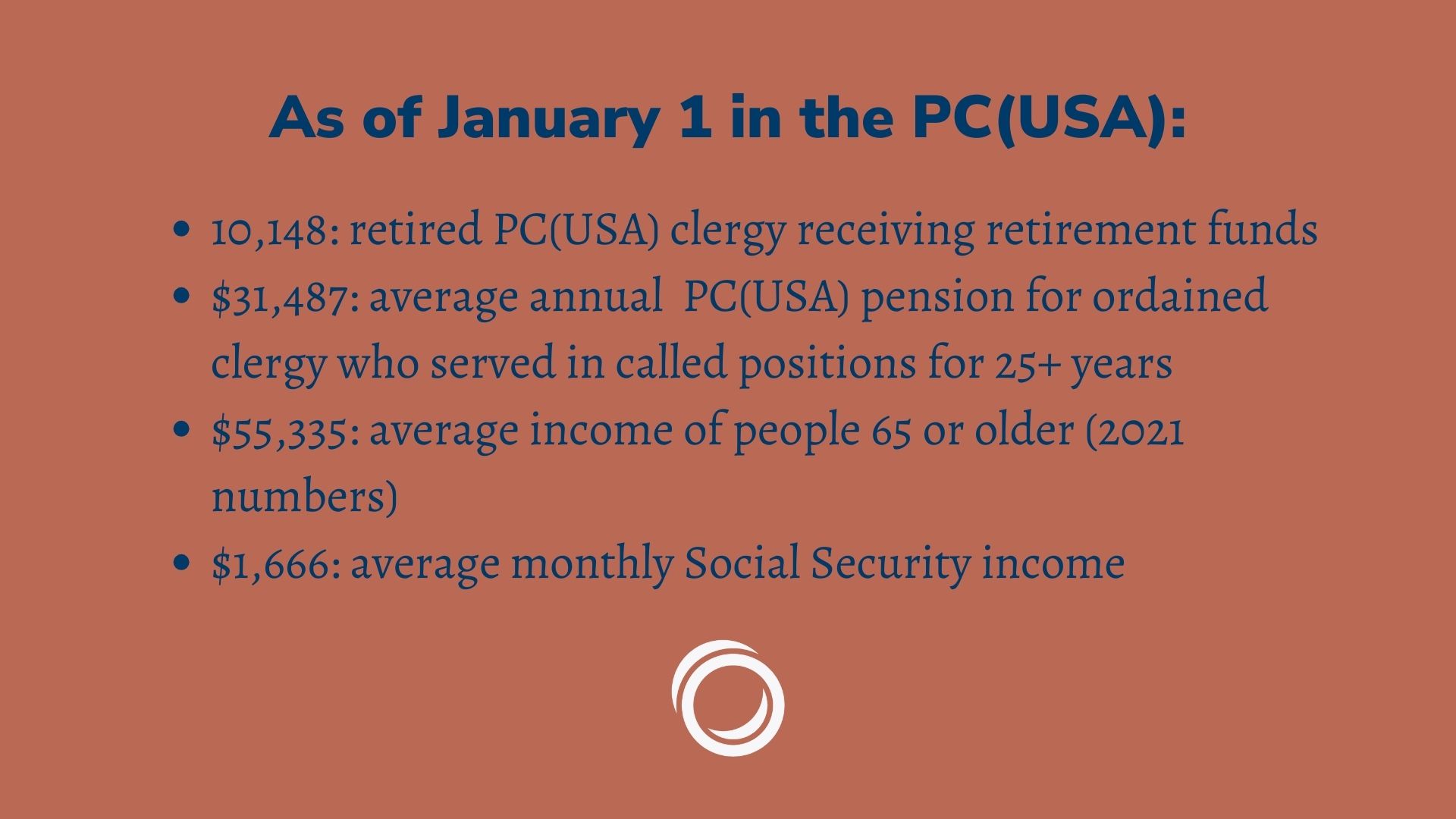 The Board of Pensions reports that annual income for all retired clergy in January 2024, regardless of years of service, was estimated at $29,274. For ordained clergy who served in called positions for 25 or more years, the average annual pension income is slightly higher at $31,487. When accounting for an average monthly social security benefit of $1,767 in 2024, retired PC(USA) clergy will receive, on average, between $50,478 and $52,691 before accounting for income from other sources such as retirement savings, IRAs, personal investments or part-time work.