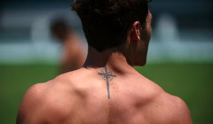 At the Summer Games, in particular, lots of skin is on display, and many athletes use it as a testament to faith. There’s Anthony Davis – usually playing for the NBA’s Los Angeles Lakers – with a cross and praying hands across his forearm. Fellow basketball pro Jayson Tatum, of the Boston Celtics, has a collection of religious tattoos, including “God’s will” and “Proverbs 3:5-6” across his back.