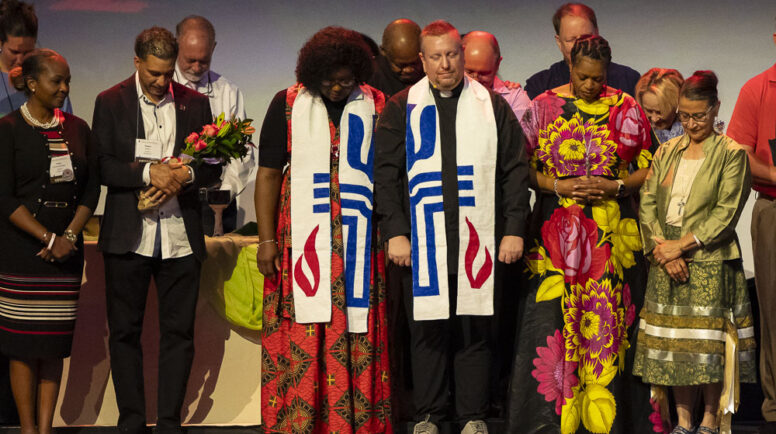 “What if you made the PC(USA) symbol across both of our stoles?” Armstrong asked. “The PC(USA) cross logo is important and it would be really cool if it could symbolize that we stand together.” Phillips got to work on the stoles with the goal of finishing them in early June. Life got in the way so she ended up having to mail them overnight on June 25 — just as Armstrong was packing her bags to come to the assembly.