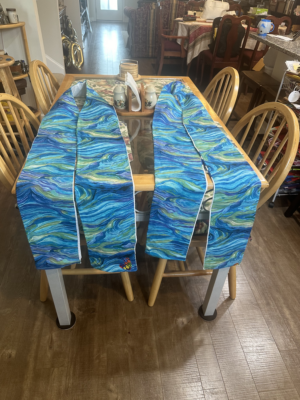 Phillips said that all of her stoles are imperfect, which gives them character and reminds the recipient that they are hand-made with love. She notes that she always tries to make her stoles reversible so the recipients can flip them over and wear them for multiple purposes or liturgical seasons. She enjoys finding fabric that represents water so that the stoles can be used during baptisms, and the back of the PC(USA) cross logo stoles she made for the co-moderators do have a reverse side with a beautiful green-and-blue material that could be used during ordinary time or for a baptism.