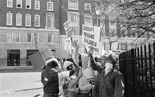In 1984, a group of Libyan expats gathered outside the Libyan Embassy in London to dispute the growing dictatorship of Muammar Gaddafi. As the rally unfolded, a window opened in the embassy and Libyan personnel began shooting into the crowd, wounding 11 protesters and killing a British policewoman.