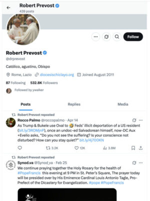 In his social media account on X (@drprevost), which he joined in 2011, Pope Leo XIV offers more hints into what moved, stirred and concerned him in 439 posts beginning in 2014.