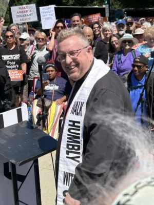 The Rev. Tony Larson, Co-Moderator of the 226th General Assembly (2024), offered the opening prayer for the Moral Monday gathering in front of the Supreme Court Building in Washington, D.C.