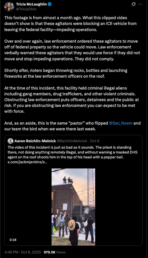 Asked by Religion News Service earlier this week about Black and the lawsuit, DHS Assistant Secretary Tricia McLaughlin responded Wednesday afternoon with a statement, shortly before posting the same statement on her X feed. McLaughlin said Black was among demonstrators “blocking an ICE vehicle from leaving the federal facility — impeding operations.” Referring to “agitators,” not Black specifically, she said they were verbally warned.