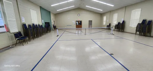 While the social hall was used occasionally by a nested Hispanic congregation and for the town’s senior meetings, the room spent most of each week empty and unused, and its design made it surprisingly ideal for pickleball. It was just large enough for a single court with space to slide the chairs that normally occupy the space to the sides. The peaked roof allows the ball to move freely during games.