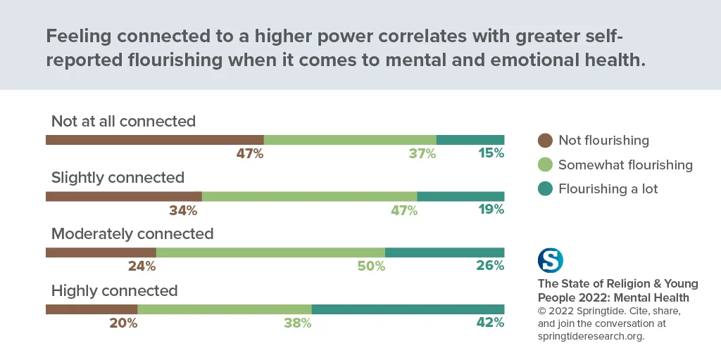 Forty-two percent of those who feel highly connected to a higher power report they are “flourishing a lot” in their emotional and mental health, compared to 16% of those who say they do not feel at all connected to a higher power.