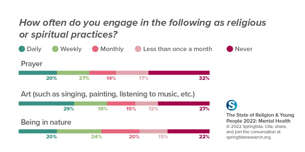 A majority of all young people (57%) and nearly three-quarters of religious young people (73%) surveyed agree their religious or spiritual practices positively impact their mental health. Many participants cite prayer as playing a role in their spiritual practice — 51% said they started praying regularly during the pandemic — and 74% of participants who pray daily say they are flourishing, compared to 57% who never pray.