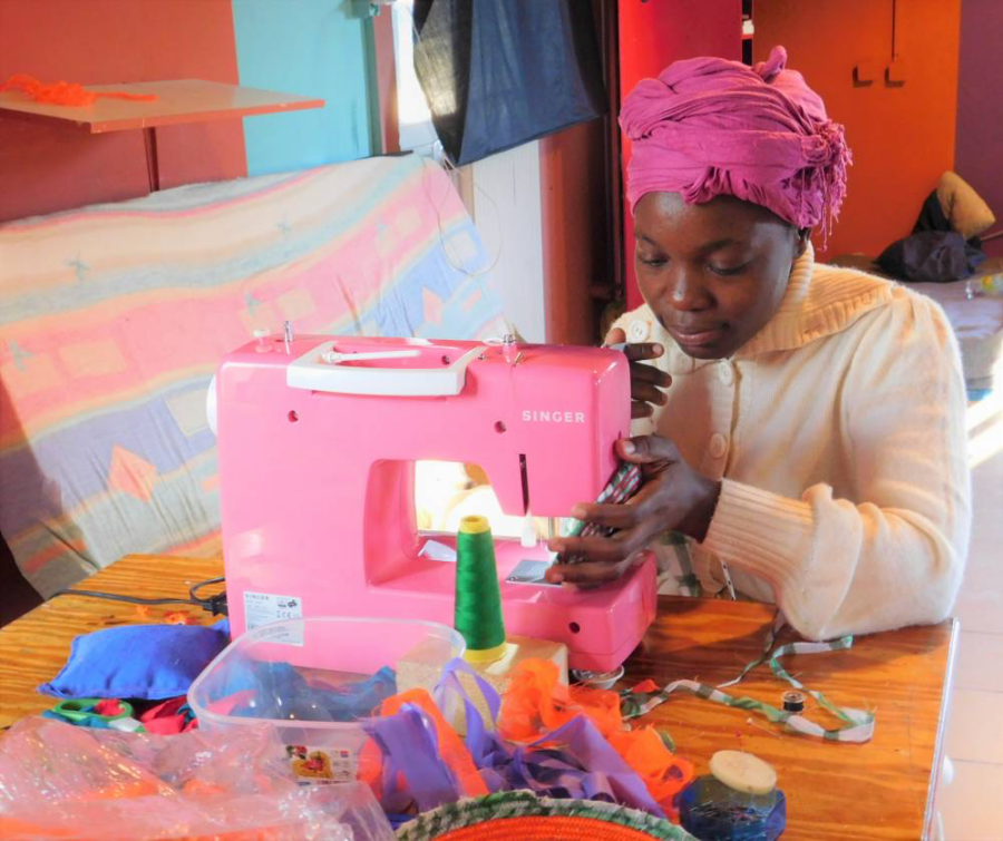 A woman who lives at Pikpa makes crafts from the life jackets left behind by refugees. (Photo by Kathy Melvin)