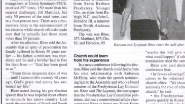 Syngman Rhee became the first Asian-American to be elected moderator of the Presbyterian Church (U.S.A.) during the first day of the 212th..